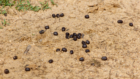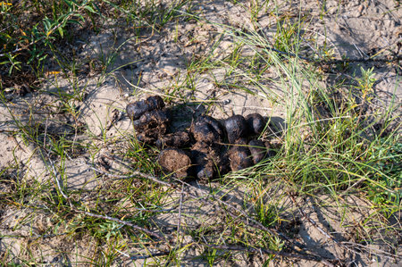 Close-up of animal droppings on soil and grass, wildlife trace in natural environment. Educational image showing animal presence, tracking signs, ecology, and nature observation.