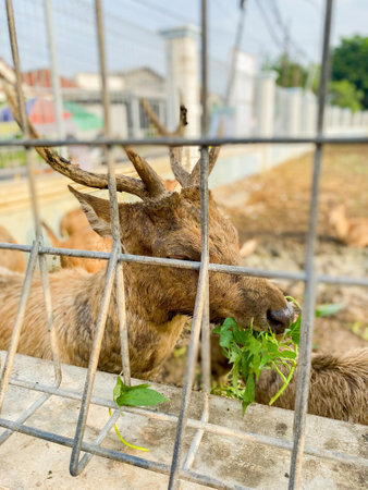 Photo of the head of an animal roe deer in a cage side view. A small animal color looking through the bars in the shade close-up.