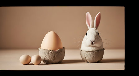 A small white rabbit sits in a coconut shell next to two eggs in a similar shell on a neutral background.