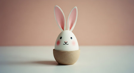 A charming white bunny figurine with pink ears and cheeks sitting on a brown egg against a pink background.