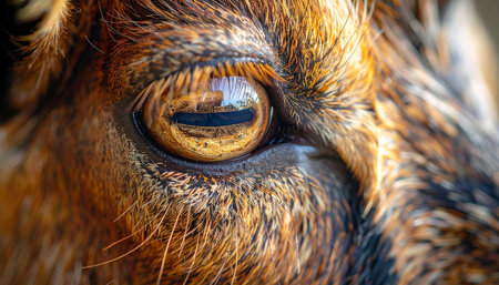 A stunning macro photograph capturing the intense and mysterious gaze of a goat. The golden iris, with its unique horizontal pupil, reflects the world in miniature, while the surrounding coarse fur adds a wild, untamed texture. This image speaks to focus, natures intricate design, and the soul of the wild.