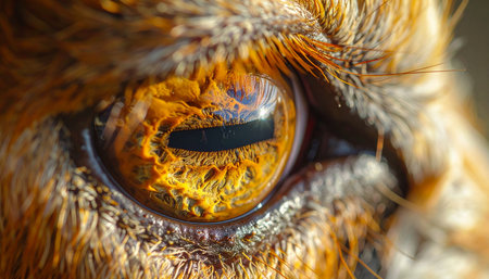 An extreme macro photograph captures the intricate details of a goats eye. The golden and amber iris reveals a complex pattern, while the unique horizontal pupil reflects the world with stunning clarity, inviting contemplation on natures incredible design and the focused gaze of wildlife.