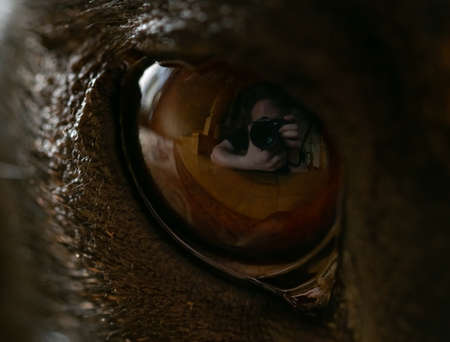 Close up of a cows eye reflecting landscape, intricate details. Nature and agriculture concept
