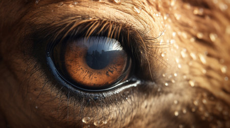 a close-up of a brown horse with water raining on its eyes, rendered in the photorealistic style of cinema4d by aleksi briclot. the detailed hunting scenes and macro lens capture the intensity of the moment, while the birds-eye-view perspective adds a unique angle to the composition. ai generated