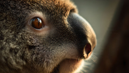 Detailed close-up of a koala's face, showcasing its unique features and textures in soft, natural light. Focus on the eye and nose.