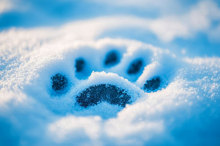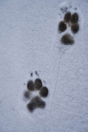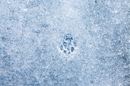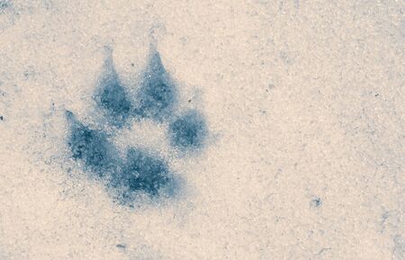 Close-up of a small dog's paw print on freshly fallen snow in the morning in the light of street lamp. Selective focus.