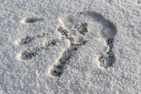 Handprint on white with a blue hue of snow with a winter sunny day. Handprint in the snow texture closeup.