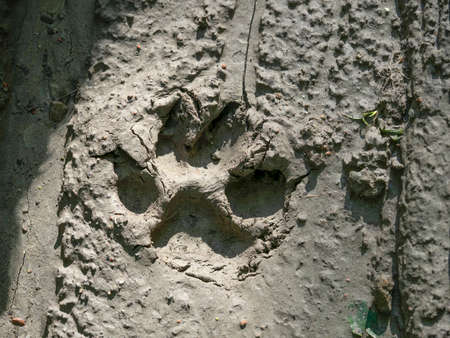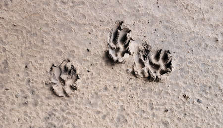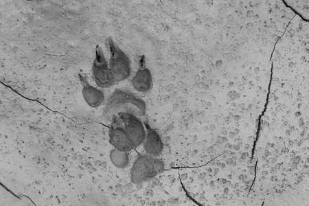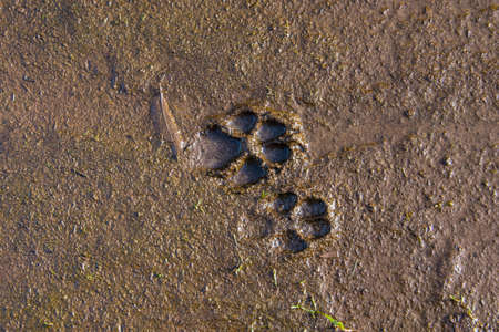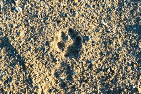 Dog or wolf track or footprint on the wet sand. Animal trace on the ground