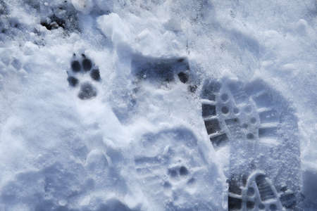 Interesting abstract white background with footprints of a cat or dog paws on the snow. Care for pets in the winter, in cold weather.