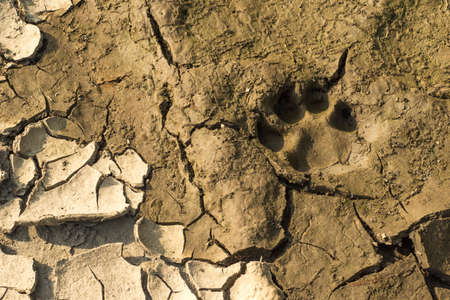 Animal footprints on abstract background rift of soil Climate change and drought land.