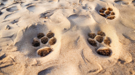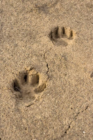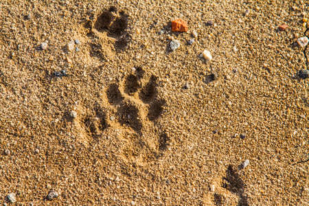 The footprints of big dog on the sand beach. Morning walk on coastline