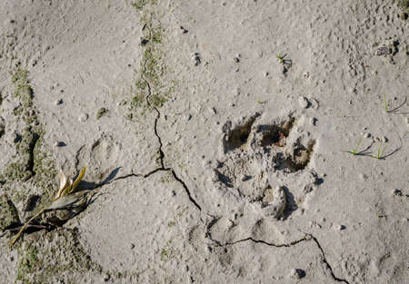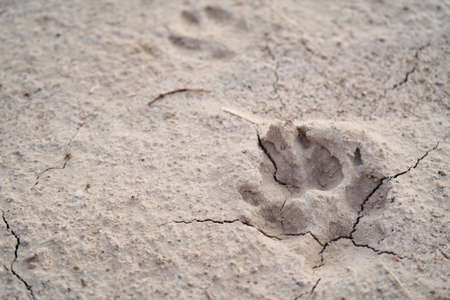 Close up of dog paw print on dry ground, sand with cracks top view, macro photo.