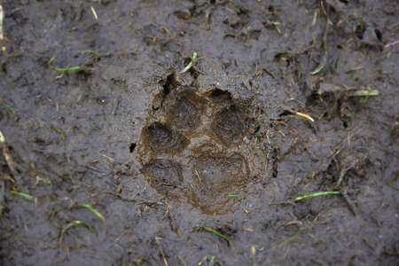 A single, clear paw print left behind in the dark, wet mud tells a silent story of a wild creature's journey.