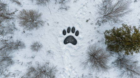 An aerial perspective of a large paw print etched into the snow reveals the presence of wildlife in a serene winter landscape, showcasing nature's beauty and the animal's activity.