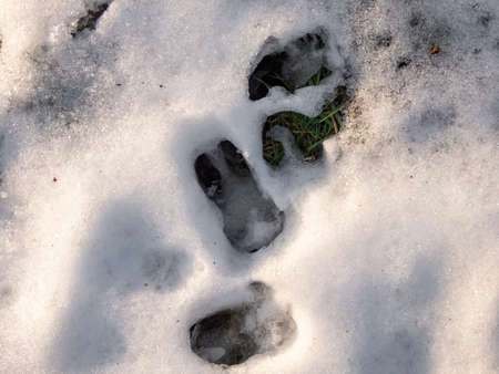 Close up of footprints of roe deer (Capreolus capreolus) in deep, melting snow after running with visible ground in footprints. Animal trail