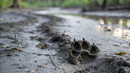 A line of fresh paw prints marks a path through the wet, dark mud, leading into the mysterious, blurred distance. Each footprint tells a story of a solitary journey, a silent passage of an unseen creature, evoking a sense of wilderness, mystery, and the untamed spirit of nature.