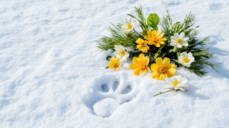 Overhead view of a dog's paw print on snow, leaving room for text or a logo.