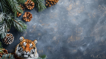 A tiger is seen in a forest setting, surrounded by scattered pine cones on the ground. The tigers orange fur contrasts with the green pine needles, creating a striking visual. The tiger appears alert and observant, possibly on the hunt or exploring its surroundings.