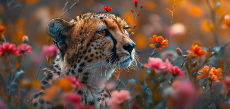 Cheetah Portrait Amidst Blooming Flowers in a Sunny Meadow