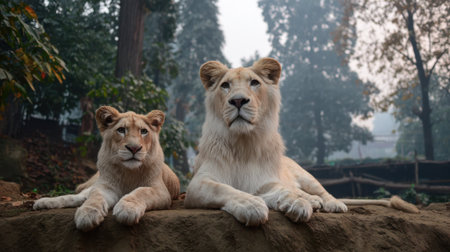 serene moment lioness and her playful cub sit side side amidst tall trees their fur illuminated softly shadowy backdrop embodying deep connection.