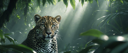 AI Generated. A majestic leopard blending into the dense green foliage of its natural jungle habitat