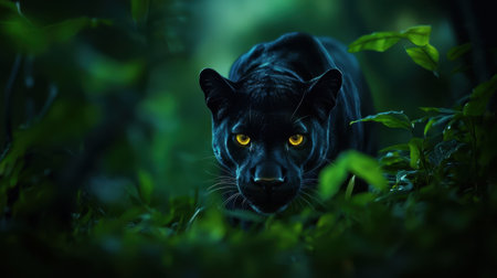 A black jaguar stalks quietly through lush green vegetation, its golden eyes shining in the dim light. The surrounding jungle creates an intense atmosphere of mystery and anticipation.