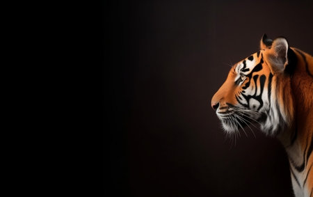 Explore the captivating gaze of a tiger emerging from a shadowy backdrop. This striking close-up reveals the creature's powerful presence and intricate details.