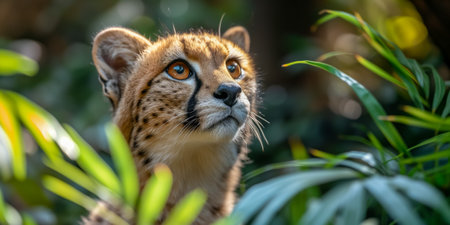 Young cheetah cub curiously peeking through green foliage, showing its bright orange eyes