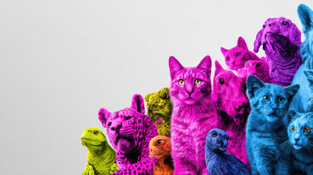 Realistic animals including cats and dogs are presented in vibrant colors and textures against a white backdrop, leaving space for text overlays.