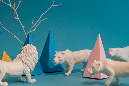 A vibrant display of colorful plastic animal figurines including a lion, zebra, giraffe, fox, and cat set against a lush green forest backdrop. Perfect for children's playtime.