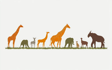 A colorful lineup of various wild animals including giraffes elephants and zebras among others all displayed in a stylized manner on a simple background with grass.