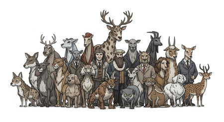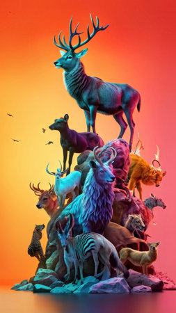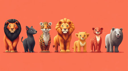 diferent whild animals as people in row, vibrant color, diversity and inclusion, world animal day concept.