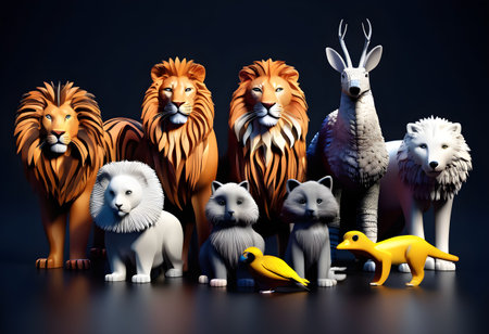 This image presents a collage of various wildlife animals. It showcases a lion, fox, parrot, bear, dolphin, and owl. The composition features diverse textures, including fur, feathers, and scales. The animals are set against natural backgrounds, suggesting an outdoor environment. This visual is suitable for commercial and editorial purposes.