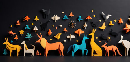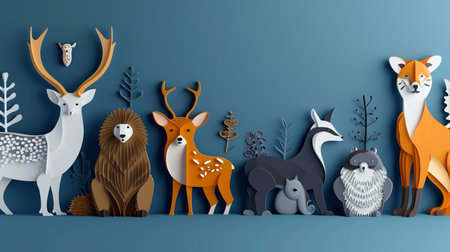 Various papercut animals, including a lion, deer, giraffe, and elephant, stand amongst colorful trees and white clouds against a dark blue background.
