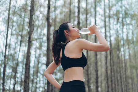 Beautiful asian woman drinking cool water bottle in the forest nature for relaxing after runner exercise cardio workout or loss of sweat recovery refreshment active healthy lifestyle at mountain hill.