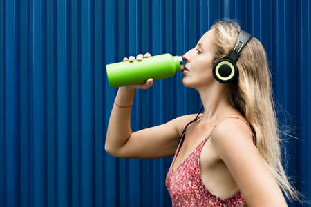 Young blond woman on blue background drink fresh spring water from green reusable bottle.