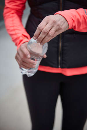 Young sports woman drinks bottled water. Sports lifestyle, fluid replenishment
