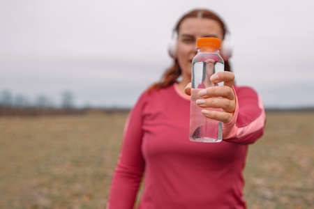 Beautiful Caucasian girl athlete in dressed in sportswear with fitness tracker on stadium does fitness and holds plastic water bottle. selective focus. Happy female sport and healthy lifestyle concept