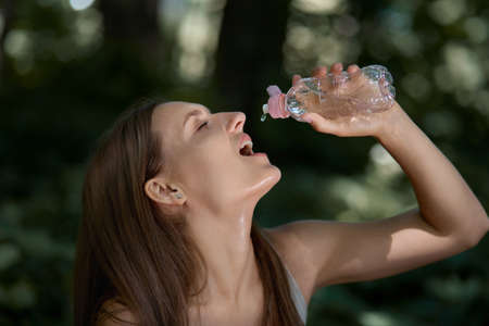 Outdoor sports. Young brunette woman quenches her thirst with water. Summer park.