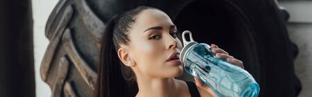 Panoramic shot of sportswoman drinking water and looking at camera near tire
