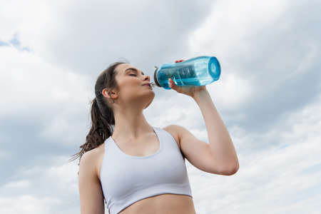 low angle view of brunette woman in crop top drinking water against sky with clouds