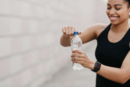 Vital energy, water and sport. Happy african american girl in sportswear with modern headphones and smart watch, opens bottle on training in city, close up, copy space