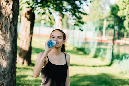 Young brunette woman quenches her thirst with water after playing sports. Outdoor sports.