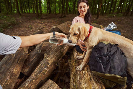 Dog drinking water from plastic bottle. Pet owner takes care of his labrador retriever during hot sunny day.