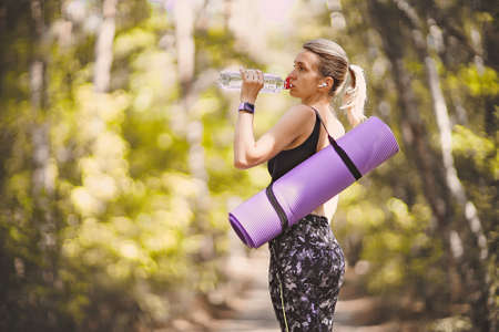 Woman in sport clothes holding a yoga mat and drink water from plastic bottle after workout.