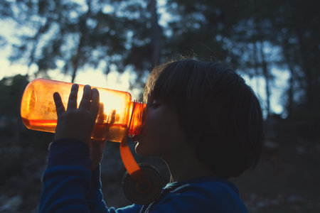 A child drinks water from a refillable bottle, The boy quenches thirst after a walk in the park, Toddler on a camping trip, Rest for a walk in the forest.