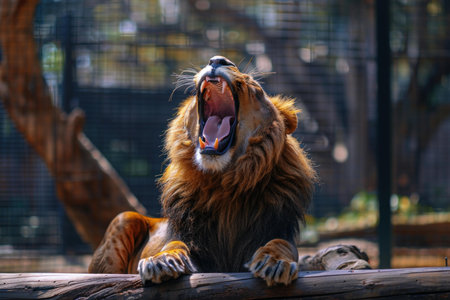 Powerful male lion yawning or roaring behind bars in a zoo habitat