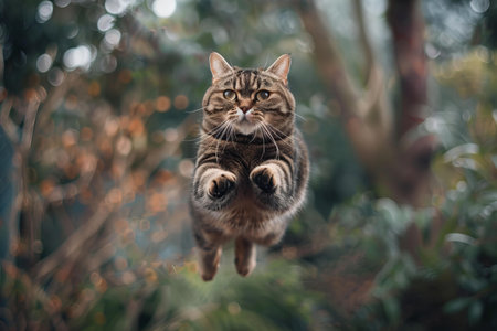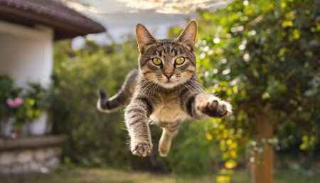 Funny cat flying. A playful tabby cat jumping mid-air looking at camera.