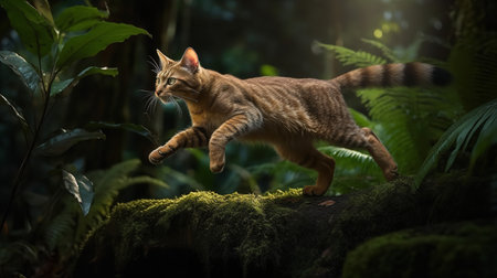 An action-packed, high-resolution photograph captures a Caracat, a rare cat breed, during a bold leap amidst the vibrant foliage of a rainforest ambiance, highlighting its wild instincts and athleticism.
