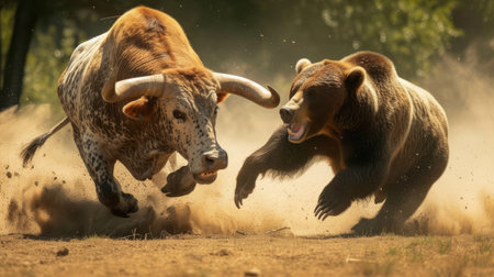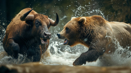 Furious bear and angry bull face off symbolizing stock market conflict and financial tensions